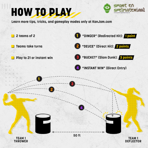KanJam is makkelijk aan te leren en geschikt voor spelers vanaf 8 jaar. Het bevordert niet alleen lichaamsbeweging, maar ook samenwerking, oog-handcoördinatie en reactievermogen.