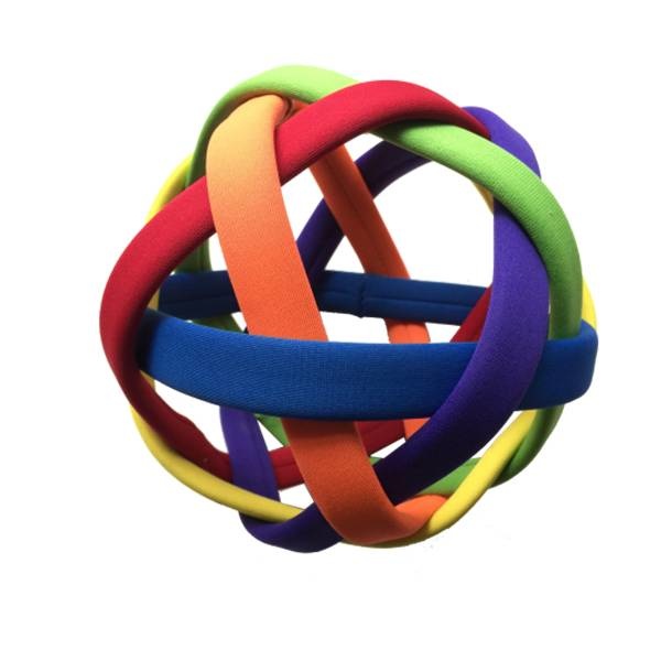 De weavebal is gemaakt van gevlochten plastic strips bedekt met een kleurrijk foam.
